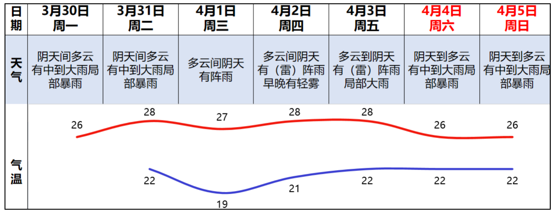 4月1日至2日,降水减弱,多云间阴天,有阵雨;4月3日起,受高空槽和弱冷空气补充影响,仍有明显降水过程,并伴有强对流天气。